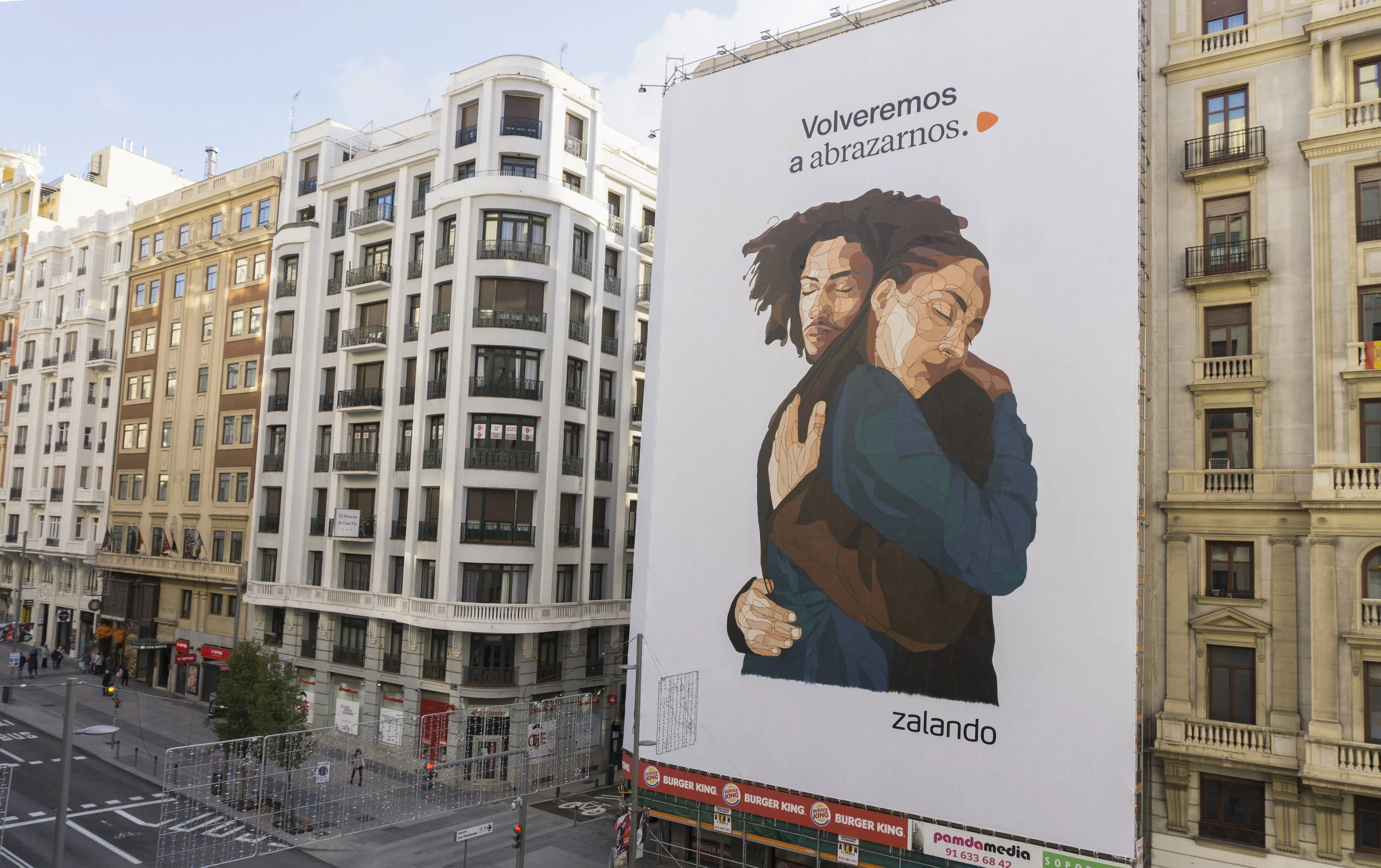 Last November I hung myself from a building measuring more than 30 meters, on Madrid's Gran Vía, to do this intervention for Zalando's latest advertising campaign. It was an incredible opportunity in a shitty year and I am so grateful. The campaign consisted of two parts that I ran for two weeks. During the first days you could read the phrase: Will we hug again? Accompanied by an incomplete hug.